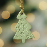 A handcrafted ceramic Christmas tree ornament in a soft sage green glaze, featuring delicate embossed motifs and finished with a festive gold hanging cord. Calm, earthy, and quietly festive.