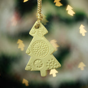 Handmade ceramic Christmas tree ornament by Clay & Glaze. Featuring embossed detailing, terracotta finish, and gold hanging cord. Perfect festive décor or Christmas gift.