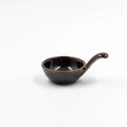 A handcrafted ceramic dip bowl in a deep brown glaze with an extended handle, perfect for serving dips, sauces, chutneys, or accompaniments with ease and elegance.