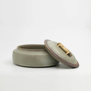 A handcrafted ceramic casserole in a soft matte grey, finished with a natural cane handle—where warmth, utility, and understated elegance meet.