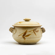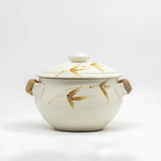 A timeless beige ceramic serving pot with lid and cane handles, handcrafted for serving curries, rice, and everyday comfort meals.